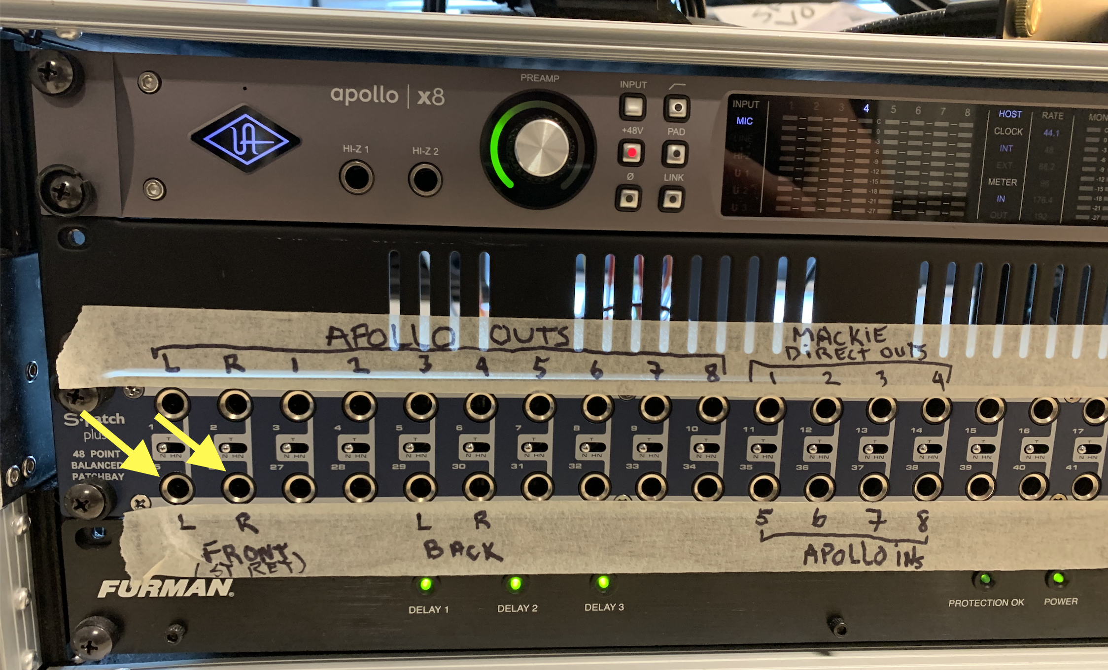 • Connect a mic into CH4. Connect the "Main out L and R" of the Mackie to the "Front L and R" of the patchbay (these speakers will act as our PA speaker). Connect the black JBL speaker to AUX Send 2 (this will be the “monitor”). Power everything on (mixer first, speakers last).