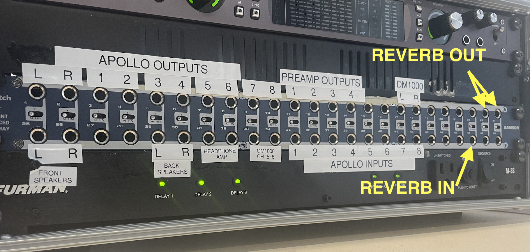 • With one TRS cable, connect the AUX send 4 on the Mackie to the "REVERB IN" on the patchbay. Then, connect two other TRS cables to the "REVERB OUT LR" on the patchbay. These last two cables are the FX RETURNS from the reverb unit.